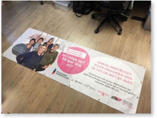 Nadarbanner die het Bevolkingsonderzoek Borstkanker onder de aandacht brengt.